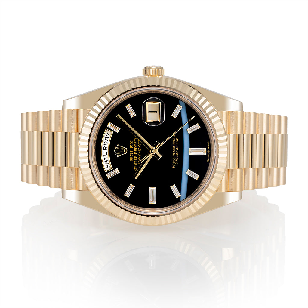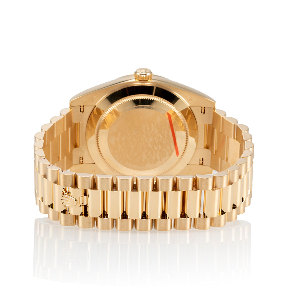Das klassische Design der Rolex Day-Date besticht durch sein luxuriöses Erscheinungsbild. Das Zifferblatt ist in verschiedenen Farben erhältlich und mit römischen Ziffern oder Indizes verziert. Die markante Tagesanzeige bei 12 Uhr und das Datumsfenster bei 3 Uhr verleihen der Uhr einen unverwechselbaren Look, der sowohl traditionell als auch modern wirkt. Das 40-mm-Oyster-Gehäuse aus 18 Karat Gelbgold ist nicht nur edel und widerstandsfähig, sondern auch bis zu einer Tiefe von 100 Metern wasserdicht, was das Uhrwerk zuverlässig vor äußeren Einflüssen schützt.