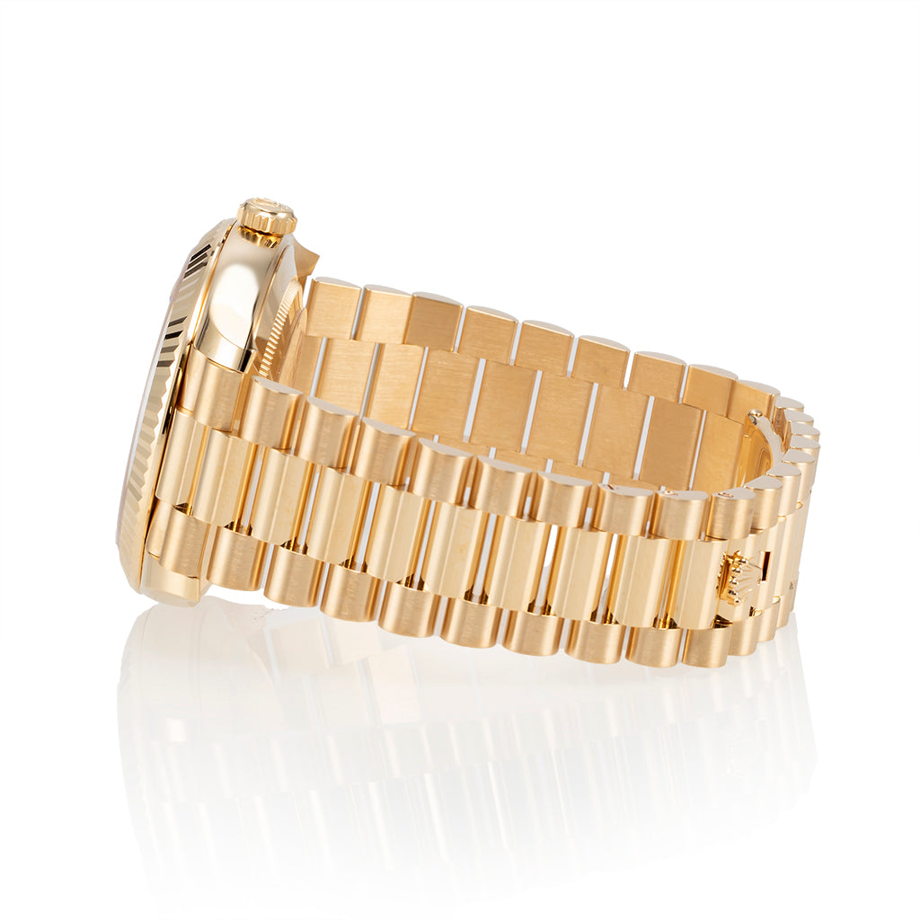 Das President-Armband mit verdeckter Crownclasp-Schließe sorgt für höchsten Tragekomfort und eine perfekte Passform am Handgelenk. Jede Rolex Day-Date ist als Superlative Chronometer zertifiziert und übertrifft die offiziellen Präzisionsstandards der Schweizer Chronometerprüfstelle (COSC).