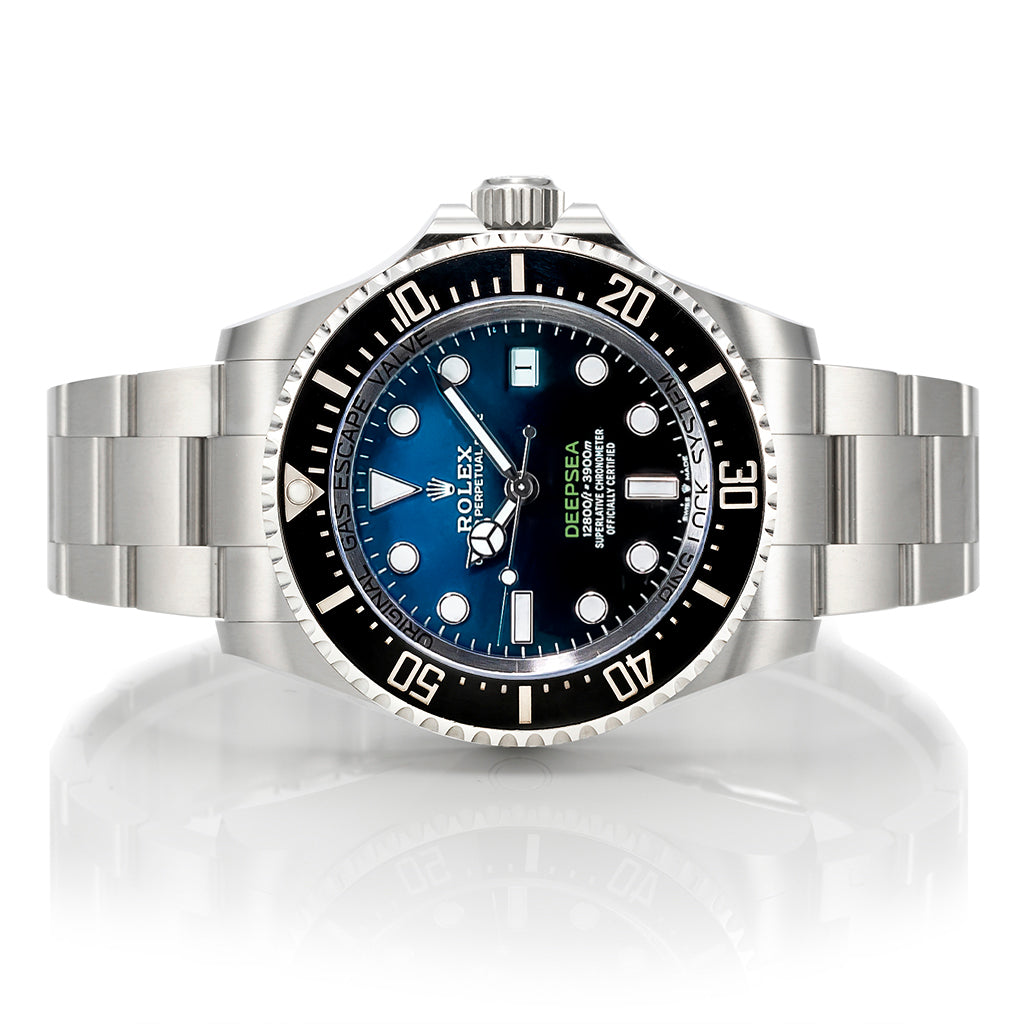 Neben ihrer Funktionalität beeindruckt die Rolex Deepsea auch mit ihrer Ästhetik. Die auffällige D-Blue Zifferblattvariante der neueren Modelle, mit ihrem Farbverlauf von lebhaftem Blau zu tiefem Schwarz, zollt der Tiefsee Tribut und macht die Uhr zu einem Blickfang sowohl unter Wasser als auch an Land.