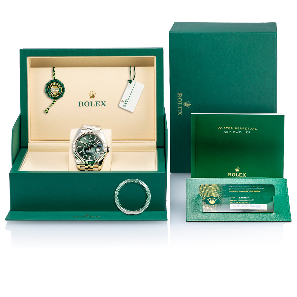 Besuchen Sie unsere Website oder unser Ladenlokal, um die exklusive Kollektion der Rolex Sky-Dweller zu entdecken, einschließlich des neuesten Modells 336934. Wählen Sie aus einer Vielzahl von Modellen, die Ihren persönlichen Stil und Ihre Reisebedürfnisse ergänzen. Die Sky-Dweller ist die ideale Wahl für jeden, der eine Verbindung von Funktionalität und Luxus in einem erlesenen Zeitmesser sucht. Unsere erfahrenen Experten stehen bereit, um Sie ausführlich zu beraten und Ihnen dabei zu helfen, das perfekte Modell zu finden. Erleben Sie die Welt der Rolex Sky-Dweller und nehmen Sie das ultimative Reiseaccessoire mit auf Ihre nächste große Reise.