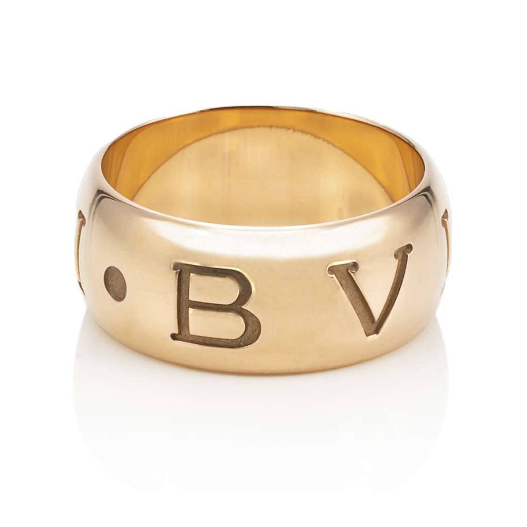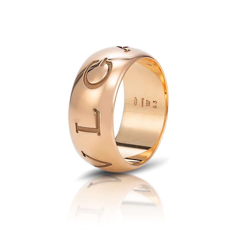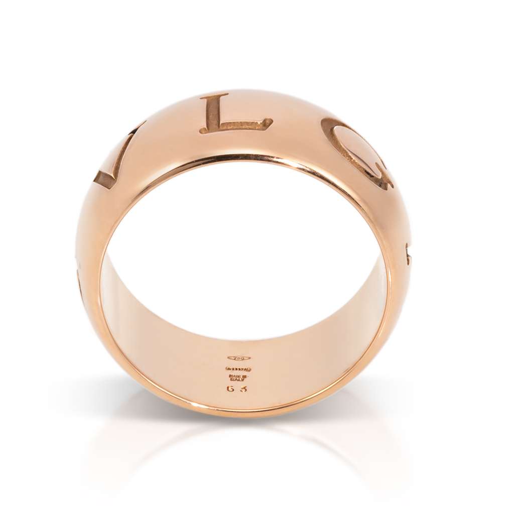 Ring from the Bulgari Monologo collection, It is made of solid 18k rose gold. The surface is finely polished, with a BULGARI logo around the entire band. The letters are executed in a fine sand grain. The shape of the band is a beautiful wide dome style that fits comfortably on the finger. The ring is very elegant, with a ring size of EU 63. It weighs 14.08 gr.